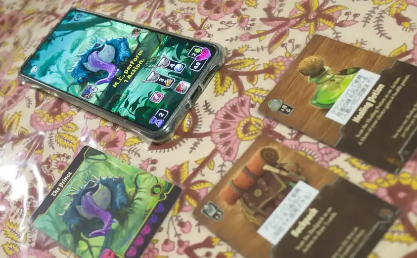 特徴はすべてのカードの裏面にQRコードが書いてあるところ。自分のターンにプレイしたカードを逐一スマホに読み込ませると、与えたダメージとか特殊効果の計算、ボスモンスター側の反撃の処理などはスマホアプリがやってくれるという仕組み。